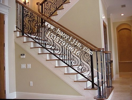 這款TYFS-002型號扶手是無錫鐵藝護欄廠為中高檔別墅、私宅設計的。此款扶手采用抽象式的圖紋,以彎花為主,將鐵絲彎成波浪狀,為了避免視線的混亂,波浪和波浪之間特別用豎的鐵條將其隔開。歡快的波浪將沉寂的樓梯點綴成活潑的過渡空間,為生活提供絲絲樂趣。