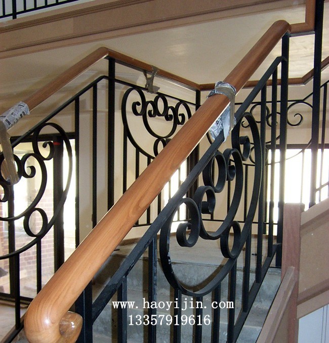 這款TYFS-013型號扶手是無錫鐵藝護欄廠為中檔別墅、私宅設計的。此款扶手欄桿為主,花型為輔。以大彎花造型掩蓋單調的欄桿樣式,彎花也是較簡單的,大方的。配上實木的面扶,此款扶手比普通欄桿扶手,多些心思,比高級的扶手,又少些精致。總之是一款實用,簡單的扶手。性價比高。