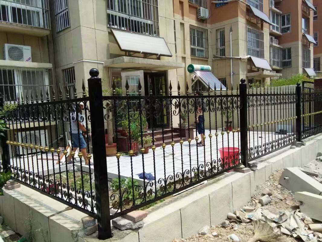 圍欄由黑色金屬制成,設(shè)計(jì)精美,帶有金色的裝飾點(diǎn)綴,顯得非常典雅。圍欄的柱子頂部是圓形的,增加了整體的美觀度。