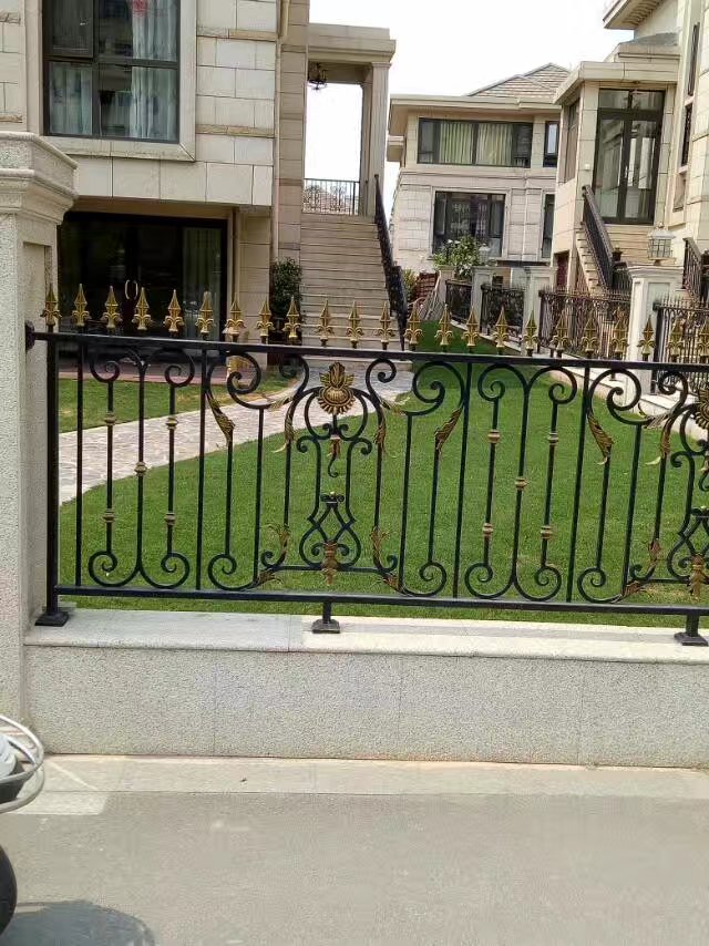 圍欄由黑色金屬制成,設(shè)計非常精致,充滿了復(fù)雜的卷曲和花紋圖案,并且在一些關(guān)鍵部位有金色的裝飾,增添了一絲華麗感。圍欄的頂部有尖銳的裝飾性尖刺,顯得非常典雅。