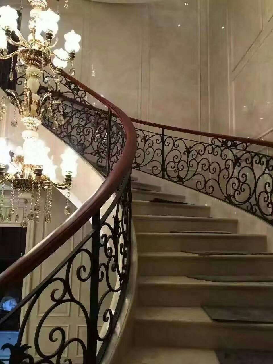 樓梯的設計非常精美,扶手和欄桿采用了黑色的鐵藝,上面有復雜的卷曲花紋和裝飾圖案,顯得非常優雅和古典。扶手的頂部是木質的,顏色為深棕色,與黑色的鐵藝形成了鮮明的對比。