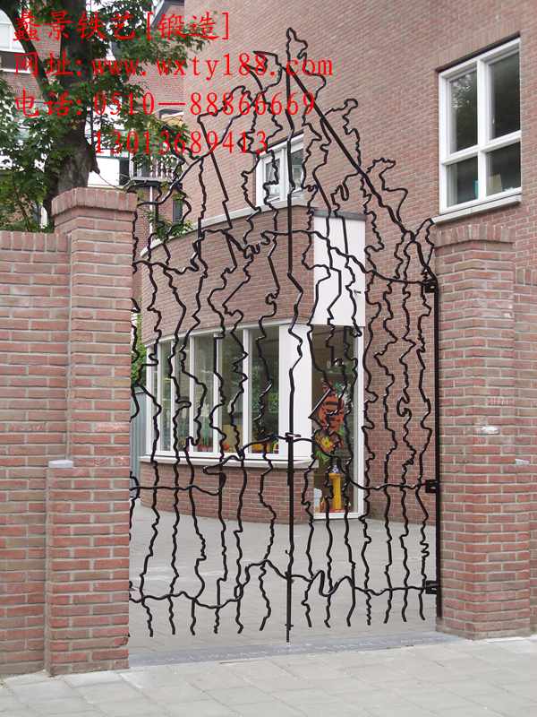 該款編號(hào)為TYM-012型號(hào)的鐵藝門是無錫鐵藝護(hù)欄廠鐵藝為別墅、庭院、花園而設(shè)計(jì)制造的一款現(xiàn)代非主流的鐵藝大門。該鐵藝門運(yùn)用凹凸沒有規(guī)律的曲線作為欄桿,保留門的造型和外框。沒有規(guī)律的曲線的交錯(cuò)上演了極其擁有創(chuàng)造力的場(chǎng)景。門不像門,像是從漫畫里走出來的城堡。讓人覺得可愛、可笑。這是一道風(fēng)景,別有用心的吸引了人們的視線。從門的每個(gè)地方都可以看出活潑、天真、想象、創(chuàng)造……,此門看似簡(jiǎn)單,實(shí)則繁雜,線條似乎是沒有規(guī)律的,但是當(dāng)組成門的時(shí)候,又不能不協(xié)調(diào),所以處處透露著工匠的細(xì)心。